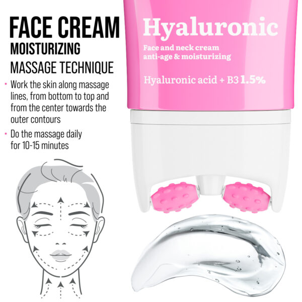 Crema facial 7DAYS MY BEAUTY WEEK Hyaluronic 80 ml + masajeador 3D para una hidratación intensiva, rejuvenecimiento y fortalecimiento de la piel. Crema facial hidratante de doble acción con Ácido Hialurónico: hidratación 24 horas + masaje facial. El Masajeador 3D FACE FIT proporciona un efecto lifting, reduce la hinchazón, suaviza las arrugas y esculpe un contorno facial firme y definido.