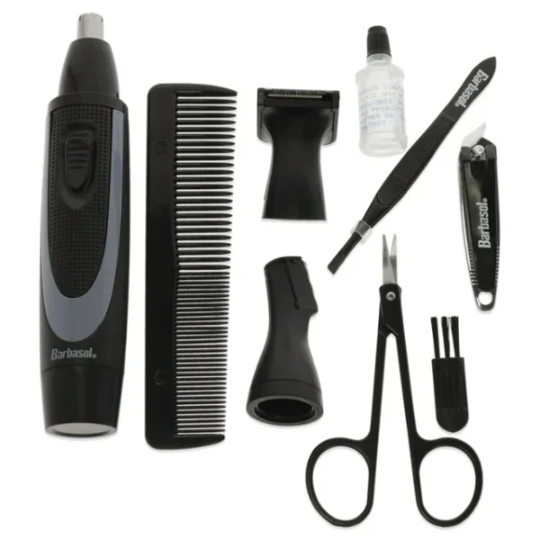 Con el Kit de Aseo de Viaje para Hombres de 10 Piezas de Barbasol®, puedes lucir lo mejor posible mientras estás en movimiento. Nuestro Recortador de Detalles a Pilas te permite estilizar y definir cómo se verá tu vello facial, y ayudará a que tu barba o patillas destaquen. El Recortador de Oídos y Nariz puede eliminar esos pelos molestos que comprometen tu apariencia. Con el Micro Recortador, puedes abordar áreas sensibles de manera precisa y segura. El set de manicura incluye un peine, tijeras, pinzas y cortaúñas para que tu apariencia sea la mejor posible. Todo viene en un estuche de almacenamiento fácil de usar que te permite llevarlos a donde necesites cuando viajes. También hemos incluido aceite y un cepillo de limpieza para tu conveniencia. Mejora tu apariencia de la cabeza a los pies con el Kit de Aseo de Viaje para Hombres de 10 Piezas.