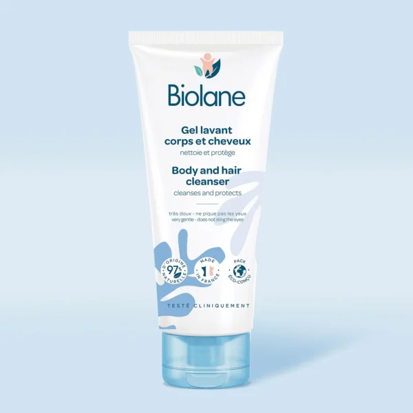 El limpiador corporal y capilar Biolane limpia suavemente y preserva la piel frágil de tu bebé para que permanezca tersa, suave y confortable.