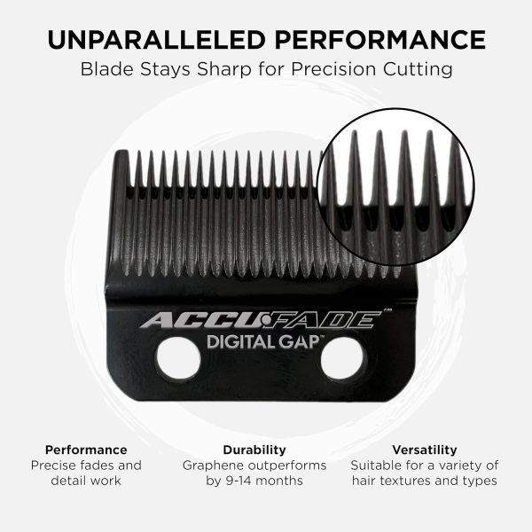 La cuchilla para desvanecimiento de grafeno Digital Gap™ AccuFade es la cuchilla más fina y precisa del mercado, diseñada para profesionales que exigen el máximo nivel de detalle . Su tecnología Digital Gap™ y su recubrimiento de grafeno redefinen los estándares de la peluquería profesional, ofreciendo la máxima precisión y fiabilidad .