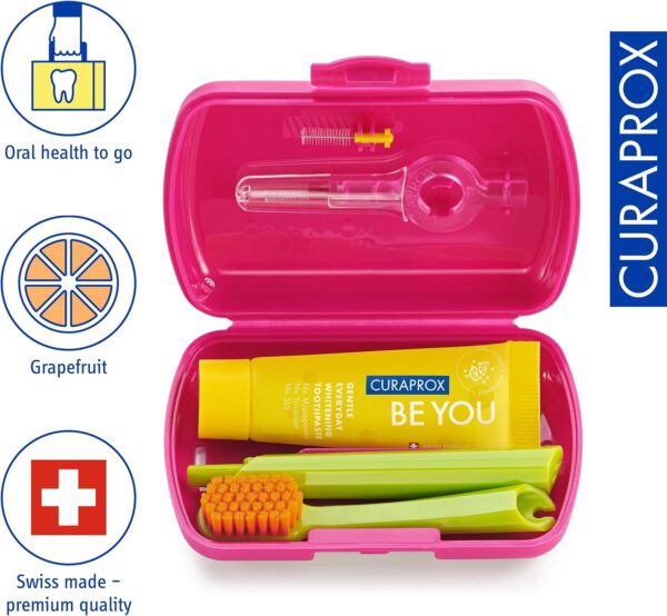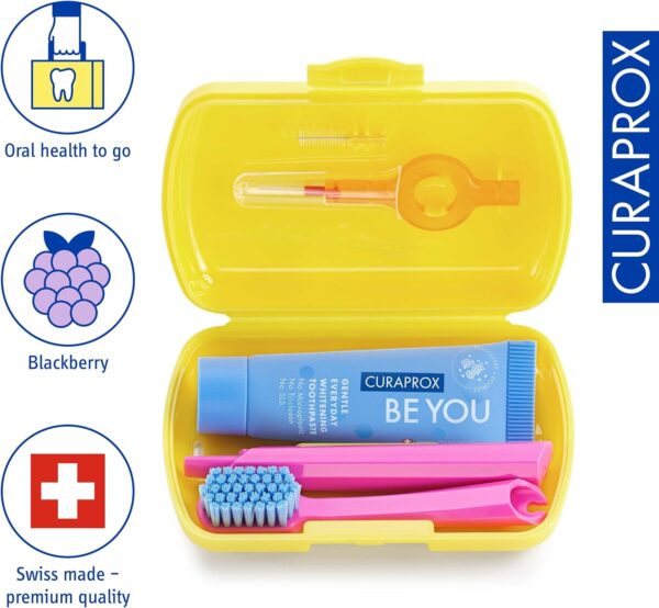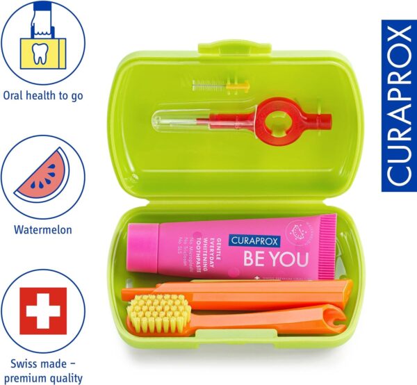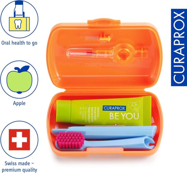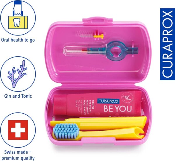 Un cepillo de dientes de viaje compacto y excepcional, 10 ml de pasta de dientes blanqueadora fresca y sabrosa y dos cepillos interdentales con un práctico soporte. Lo último en cuidado de la salud bucal de Curaprox.
