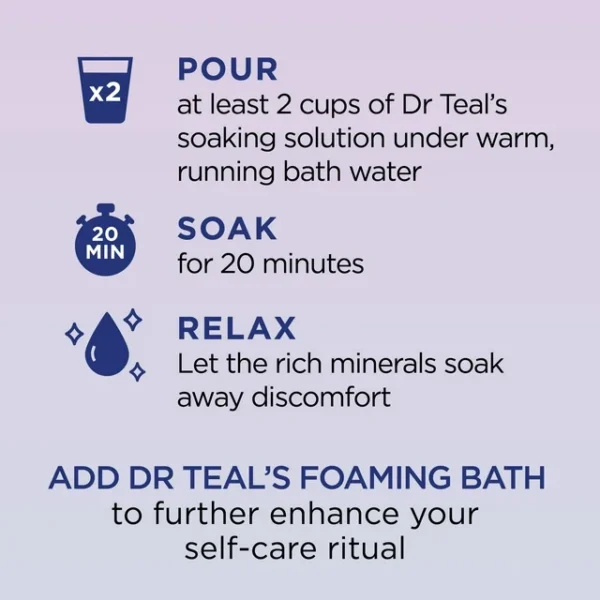 Duerme tranquilamente después de un relajante baño con Dr Teal’s Pure Epsom Salt Melatonin Sleep Soak con Mezcla de Aceites Esenciales. La Sal de Epsom Pura ayuda a aliviar dolores y molestias musculares mientras refresca la apariencia de la piel, y la melatonina contribuye a promover un mejor sueño nocturno, mientras que los aceites esenciales de lavanda y manzanilla fomentan la relajación. Los productos de Dr Teal’s están infusionados con aceites esenciales para relajar, reponer y rejuvenecer tu mente y cuerpo. Dedica un momento para ti esta noche para que te sientas lo mejor posible mañana.