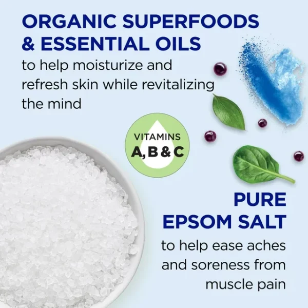 Combina la humedad con la naturaleza calmante de los aceites esenciales para una recuperación holística como parte de la Solución para Remojar Dr Teal’s Superfood, que combina Sal de Epsom Pura (Sulfato de Magnesio USP) y superalimentos ricos en nutrientes para revitalizar músculos cansados y doloridos e hidratar intensamente tu piel. Las vitaminas A, B y C y superalimentos orgánicos como col rizada orgánica, espinaca, espirulina azul y bayas de acai contienen propiedades calmantes y purificantes, proporcionando el refresco perfecto para tu piel y mente. Libre de parabenos, libre de ftalatos y nunca probado en animales, elaboramos nuestros minerales y sales corporales para disminuir tu estrés y promover todas las formas de bienestar. Crea una rutina completa y nutritiva con superalimentos y aceites esenciales con el Baño Espumoso Dr Teal’s Refresh & Revitalize y el Gel de Baño Dr Teal’s Refresh & Revitalize.