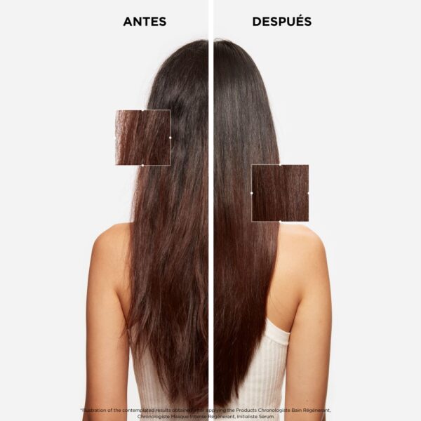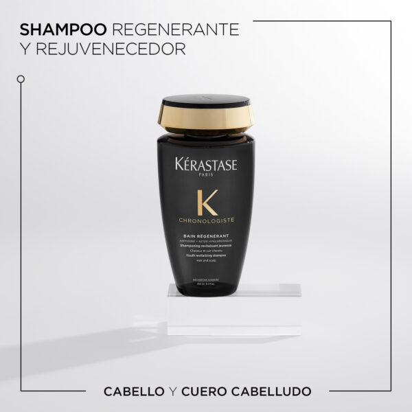 Shampoo regenerador que previene de los signos de la edad tanto en el pelo como el cuero cabelludo. Elimina suavemente las impurezas del cuero cabelludo y la fibra, y fortalece el pelo. Gracias al Ácido Hialurónico hidrata el cuero cabelludo y rellena la fibra para un pelo por el que no pasa el tiempo. Restaura el brillo