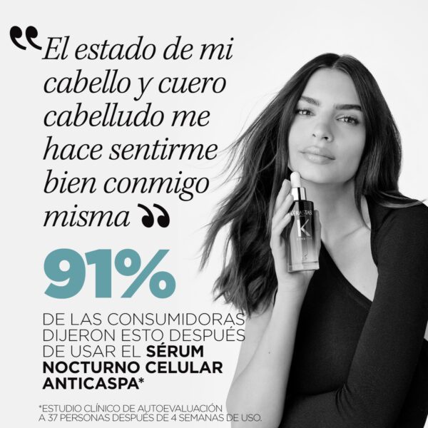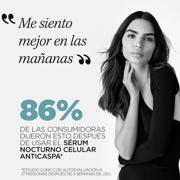 La fórmula del sérum en forma de gel transparente sin siliconas ni sulfatos** contribuye a eliminar la caspa desde el origen gracias a su acción continua durante 8 horas por la noche, el tiempo ideal de regeneración del cuero cabelludo. El sérum de noche de textura no grasa y no pegajosa preserva la barrera del cuero cabelludo para una eficacia anticaspa clínicamente probada hasta 7 semanas*.