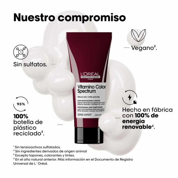 L’Oréal Professionnel Vitamino Color Spectrum Conditioner. Es un acondicionador especializado en el cuidado del cabello coloreado. Con una fórmula con ácido ferúlico y cítrico, este acondicionador ayuda a fijar el color en la fibra capilar, prolongando el color vibrante hasta por 100 días*. Este acondicionador suaviza y desenreda el cabello, aportando un brillo intenso y protegiéndolo contra el encrespamiento. Es ideal para mantener el cabello suave, manejable y con un color vibrante.