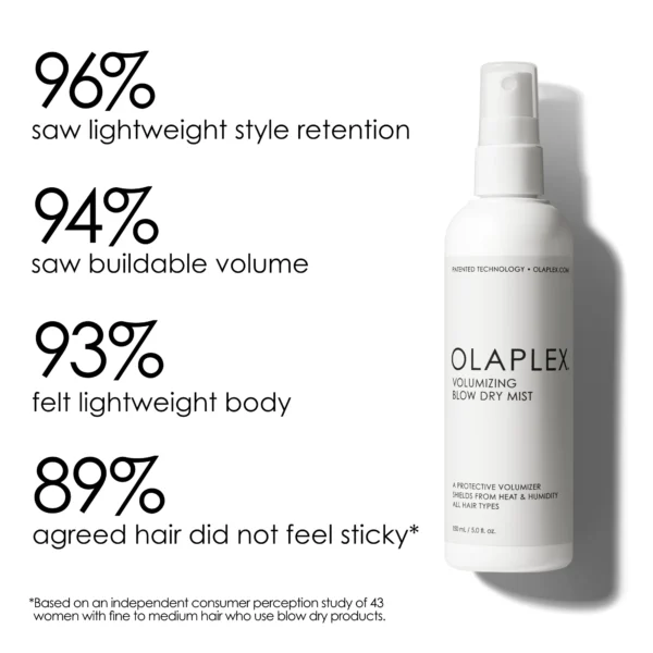 El Volumizing Blow Dry Mist, infundido con la patentada Tecnología de Construcción de Enlaces OLAPLEX, es un rocío reparador para el secado con secador que proporciona cuerpo y volumen duraderos y también protege el cabello del calor, dejándolo visiblemente suave, brillante y saludable.