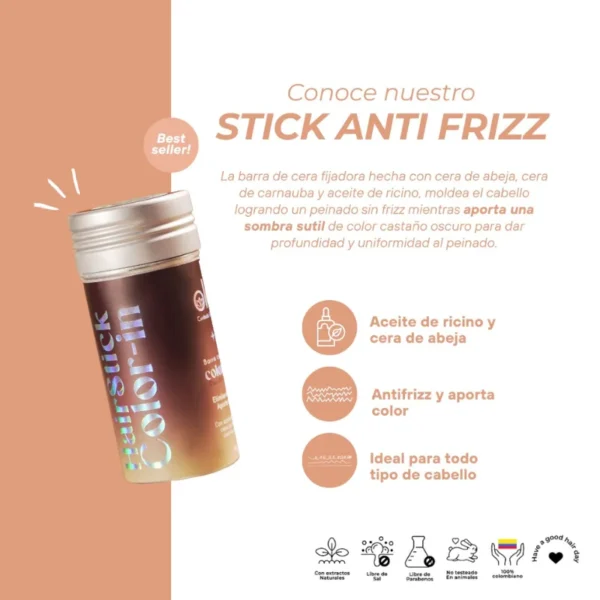 La barra de cera fijadora hecha con cera de abeja, cera de carnauba y aceite de ricino, moldea el cabello logrando un peinado sin frizz mientras aporta una sombra sutil de color castaño oscuro para dar profundidad y uniformidad al peinado.