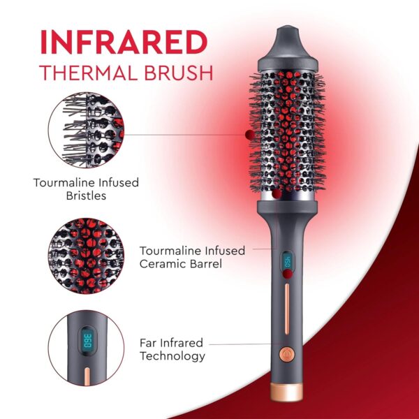 El cepillo térmico de infrarrojos cuenta con nuestras exclusivas tecnologías de calor saludable de infrarrojos lejanos (IR) y tecnologías iónicas, y un barril cerámico infusionado con turmalina que ofrece una experiencia revolucionaria de peinado en un solo paso. Las cerdas especializadas eliminan el encrespamiento y aseguran una transferencia uniforme del calor para dar un brillo hermoso y una sensación sedosa en todo momento. Simplemente cepilla el cabello para crear looks voluminosos y versátiles que siempre quedan hidratados, fuertes y revitalizados con un acabado brillante.