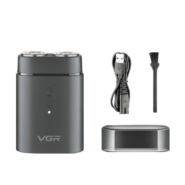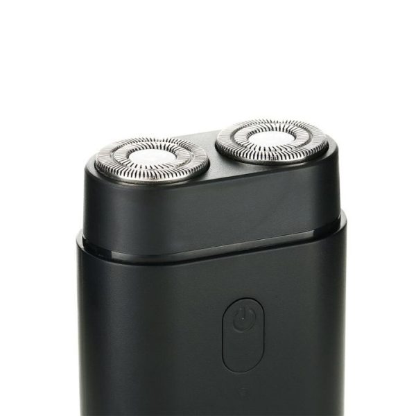 Afeitadora de bolsillo negra con carga USB, batería de 500mAh para 90 min, motor rotativo y accesorios de limpieza incluidos.