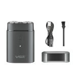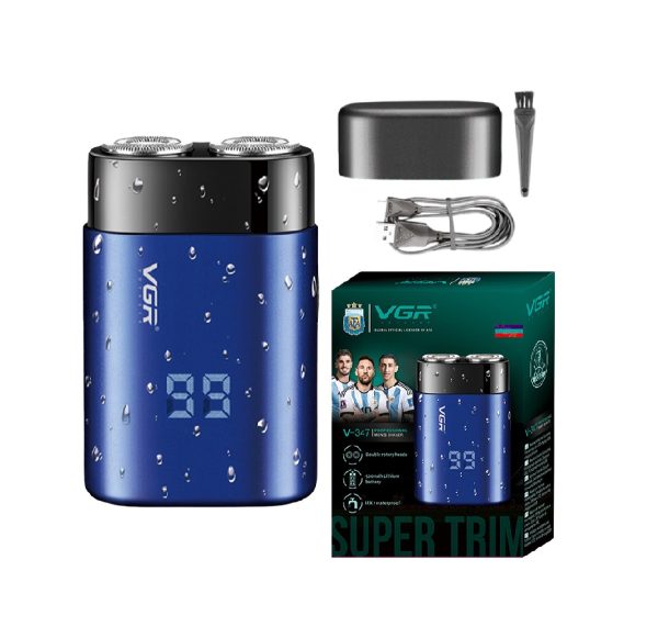 Shaver metálica azul con carga USB, batería de 800mAh para 120 min, motor silencioso y estuche de viaje.