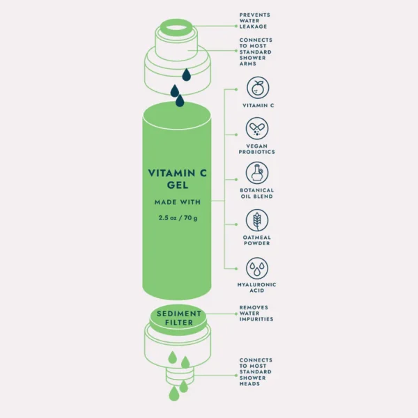 La vitamina C elimina el cloro residual y otras impurezas del agua dura para rejuvenecer la piel y acondicionar el cabello, una ducha a la vez. Los probióticos veganos fortalecen y regeneran la barrera cutánea, mientras que la avena en polvo suaviza y calma para una piel sana y brillante. Este filtro de ducha le da un significado completamente nuevo a la limpieza. ¡Será la mejor ducha que jamás hayas tomado!